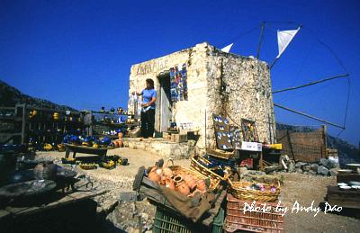 高原的頂端,有幾間石造的磨坊,大多都已塌陷廢棄,只留下一座稍微完整的,成為販賣紀念品的小店。