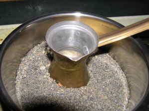 7.小壺裡的咖啡滾開了,緩緩拿起小壺(小心掉入砂子),再加冷水至8分滿。