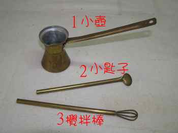 2.用照片上2的小匙子,放入三匙尖滿的咖啡到1的小壺裡。
