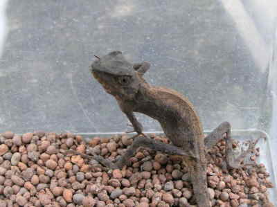 回到家,拿個舊”寵物箱”,舖一層種花的”發泡煉石”,把蜥蝪和未吃完的小毛蟲再放入,好讓它安心繼續吃完它的下午茶。