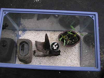 拿出舊魚缸,舖上白砂,放一盆小樹模擬自然環境,準備個小水池以供飲用,放置枯木一塊讓其攀爬。